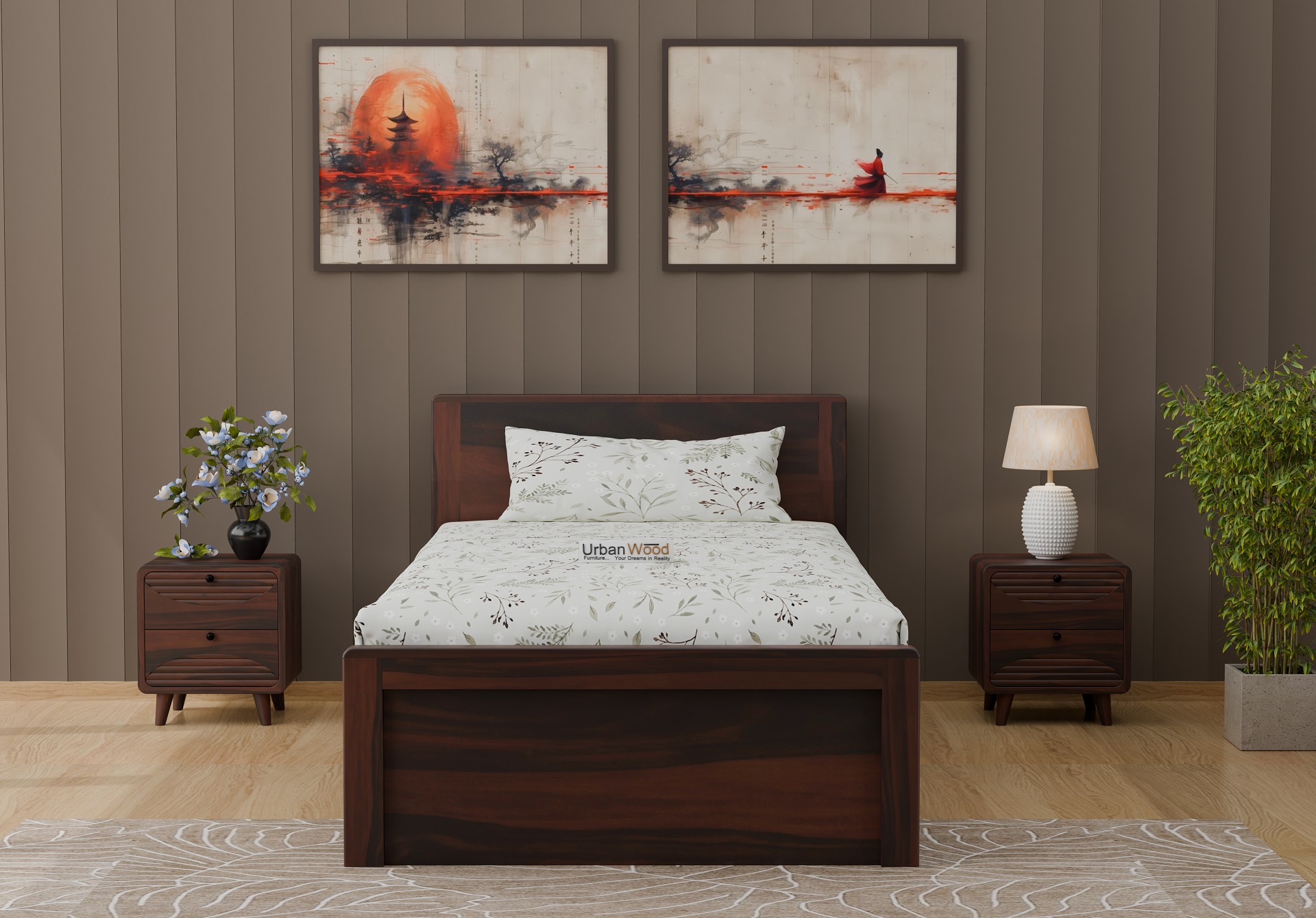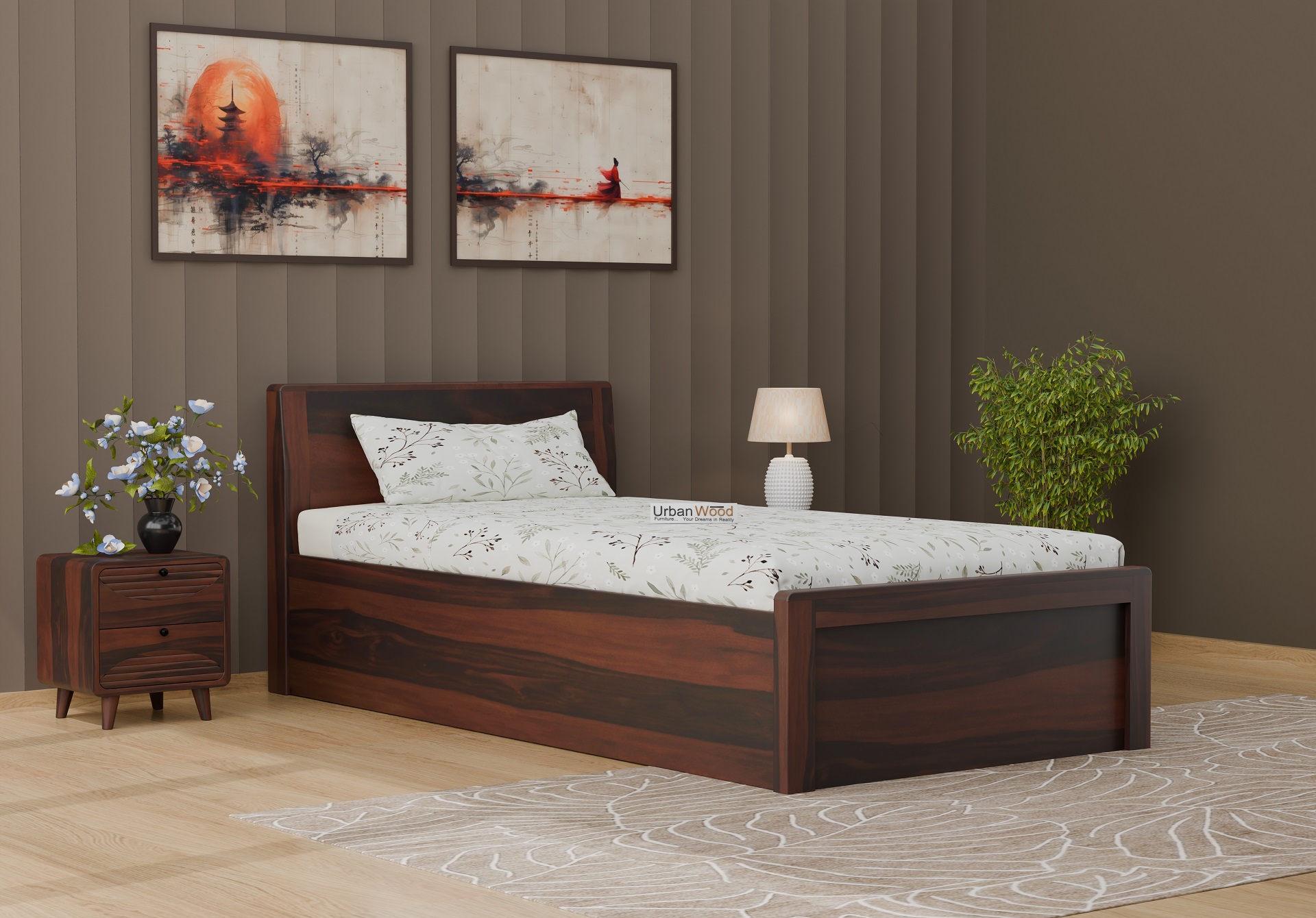 Elora Single Bed With Box Storage (Walnut Finish)