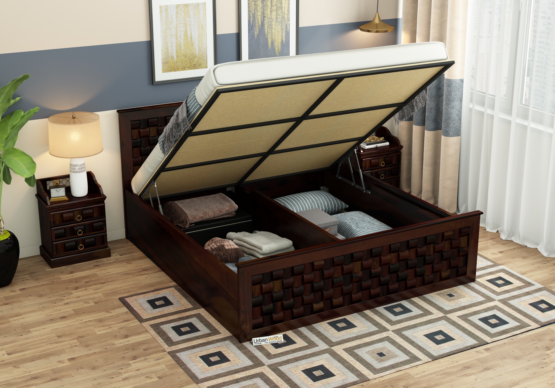 The Hydraulic Storage to this Bed gives you a hassle-free storage option. You do not have to give second thoughts to store something under your bed, just lift, store and close. The best feature a bed can get.