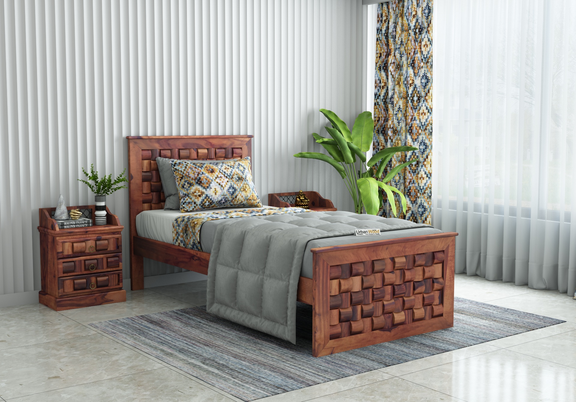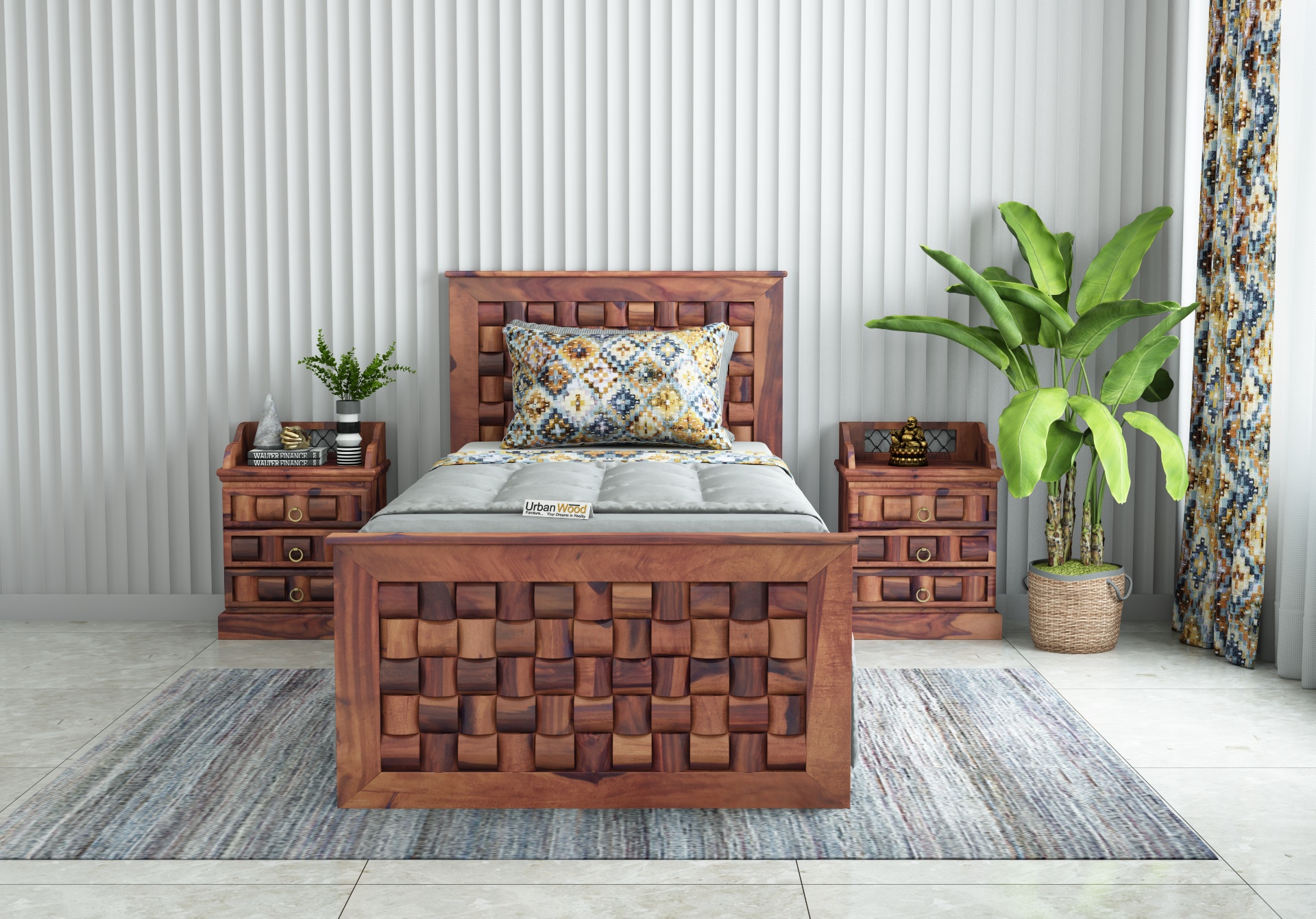 A beautifully carved headboard that is truly an eye catcher and a spacious bed for single-person accommodation at complete ease.