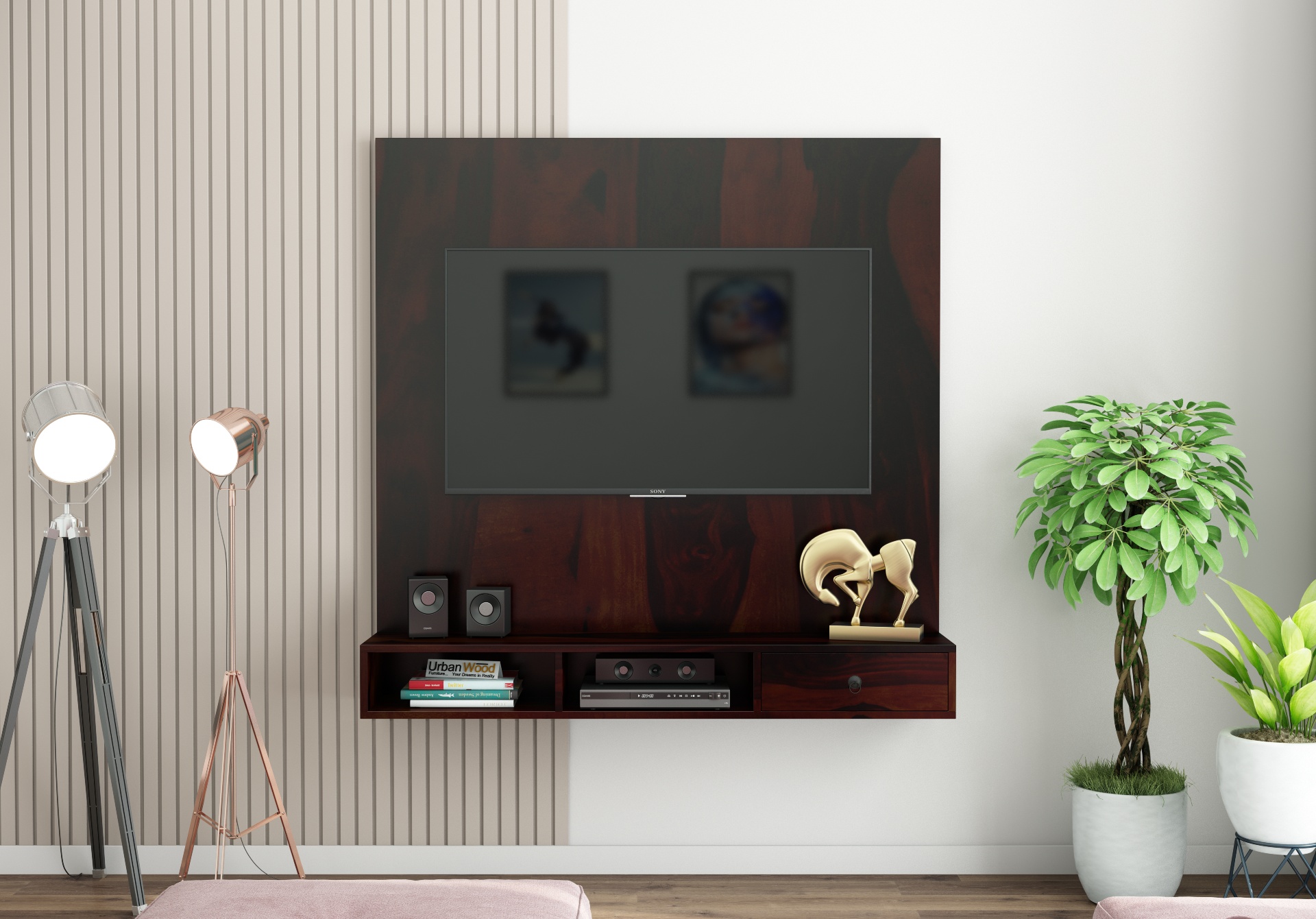 Ource wall mounted TV Unit is our exclusive creation and perfect companion for your TV. Amazing finish options will add warmth to your home interiors. With flat utility shelves and compartments it offers loads of storage space to create a cozy home for your entertainment devices.