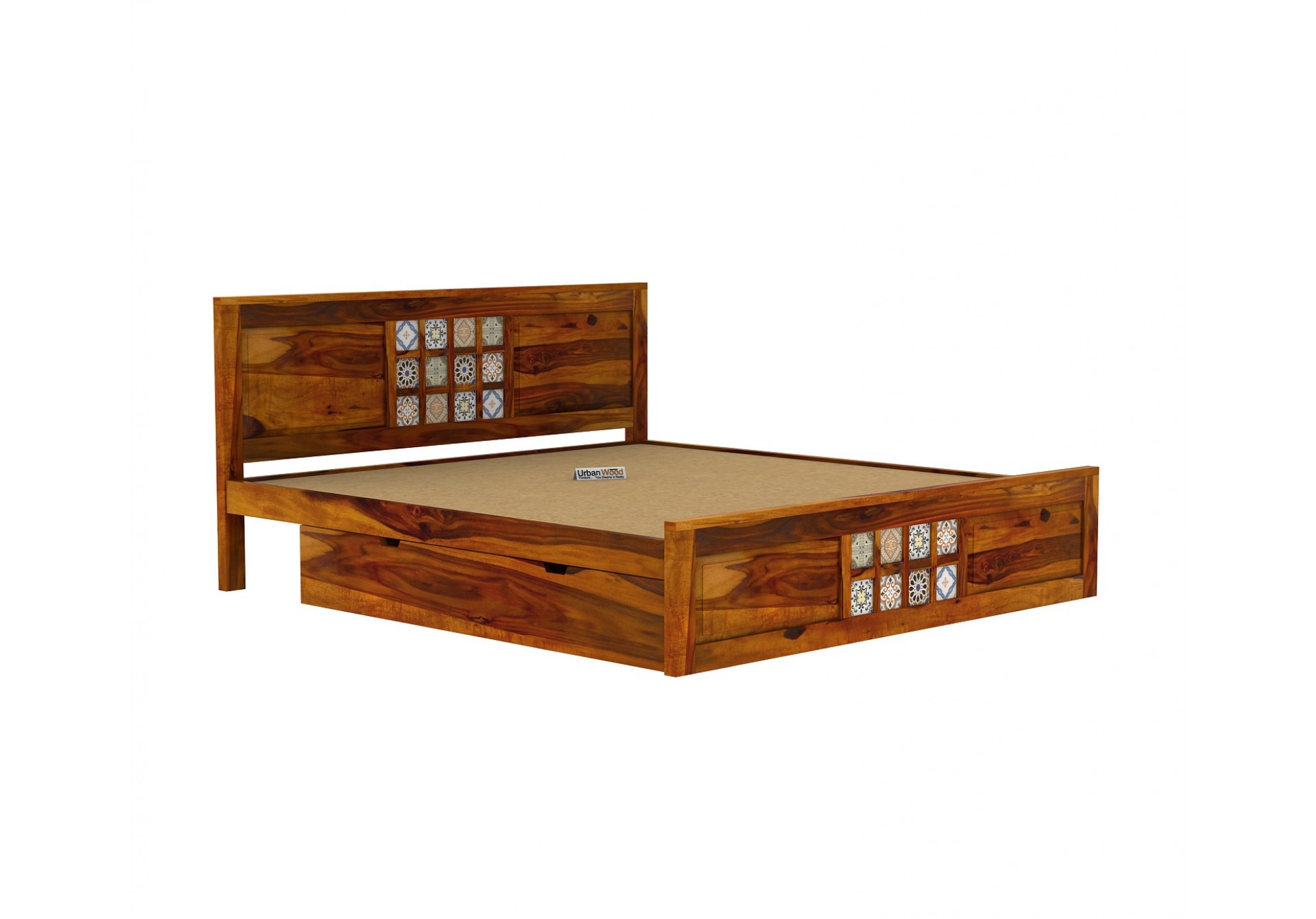 Made from original Sheesham wood, the relay double bed with box storage comes with a beautiful ceramic tiles design and eye-pleasing honey finish, bringing an instant change to the bedroom vibe.
