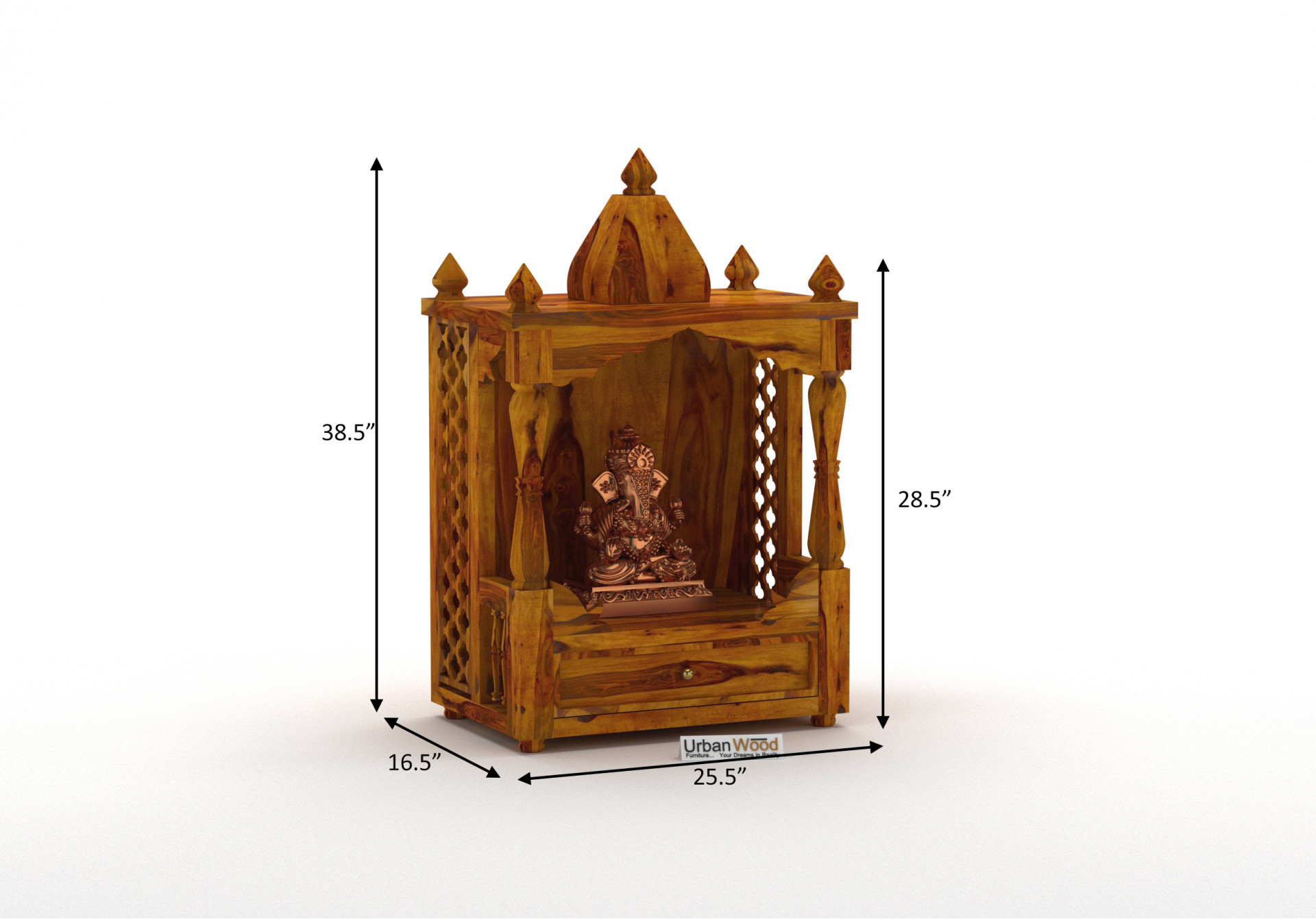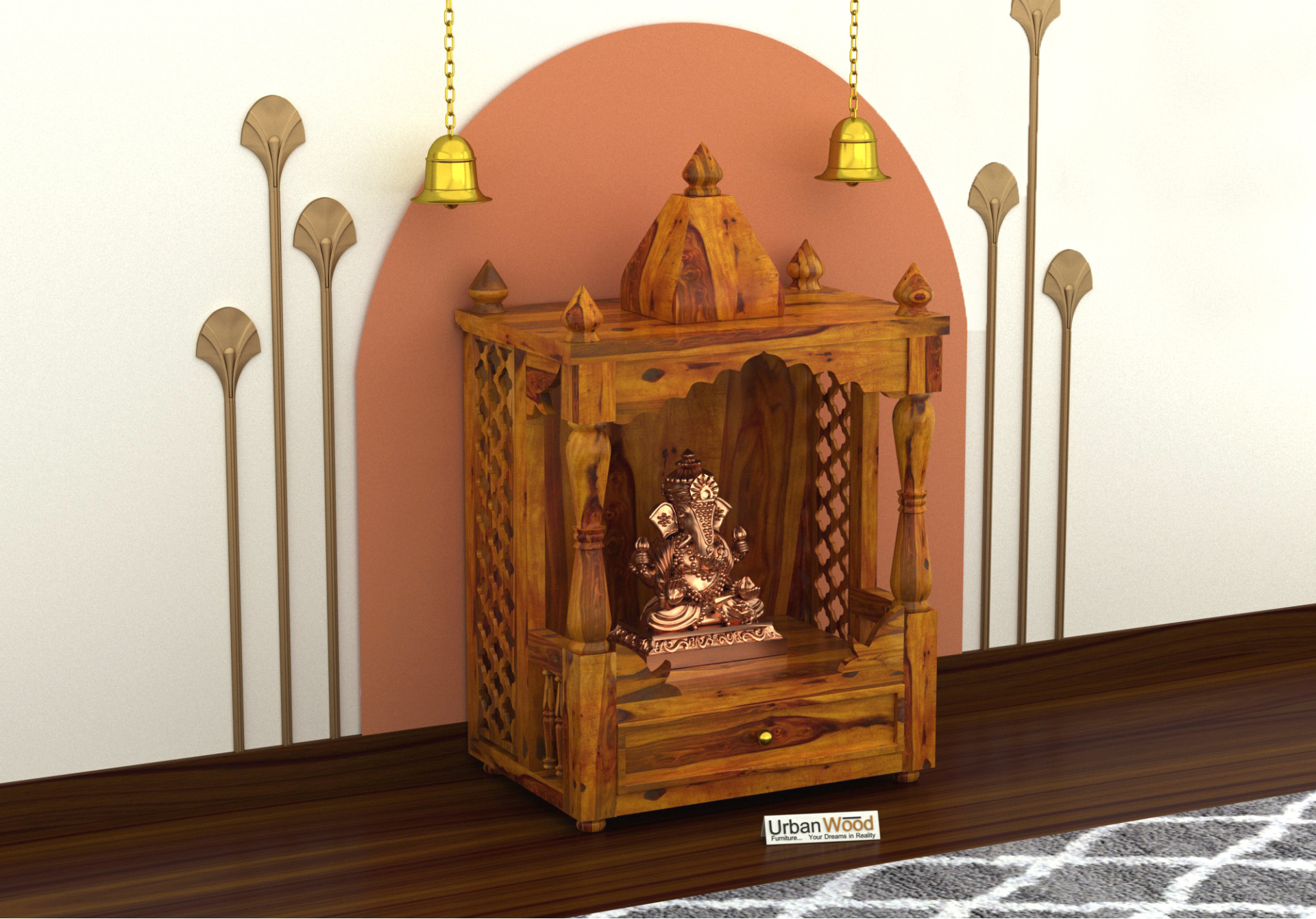 Crafted from high-quality sheesham wood, the temple exhibits the wood's natural beauty, including its rich grain patterns and warm hues.